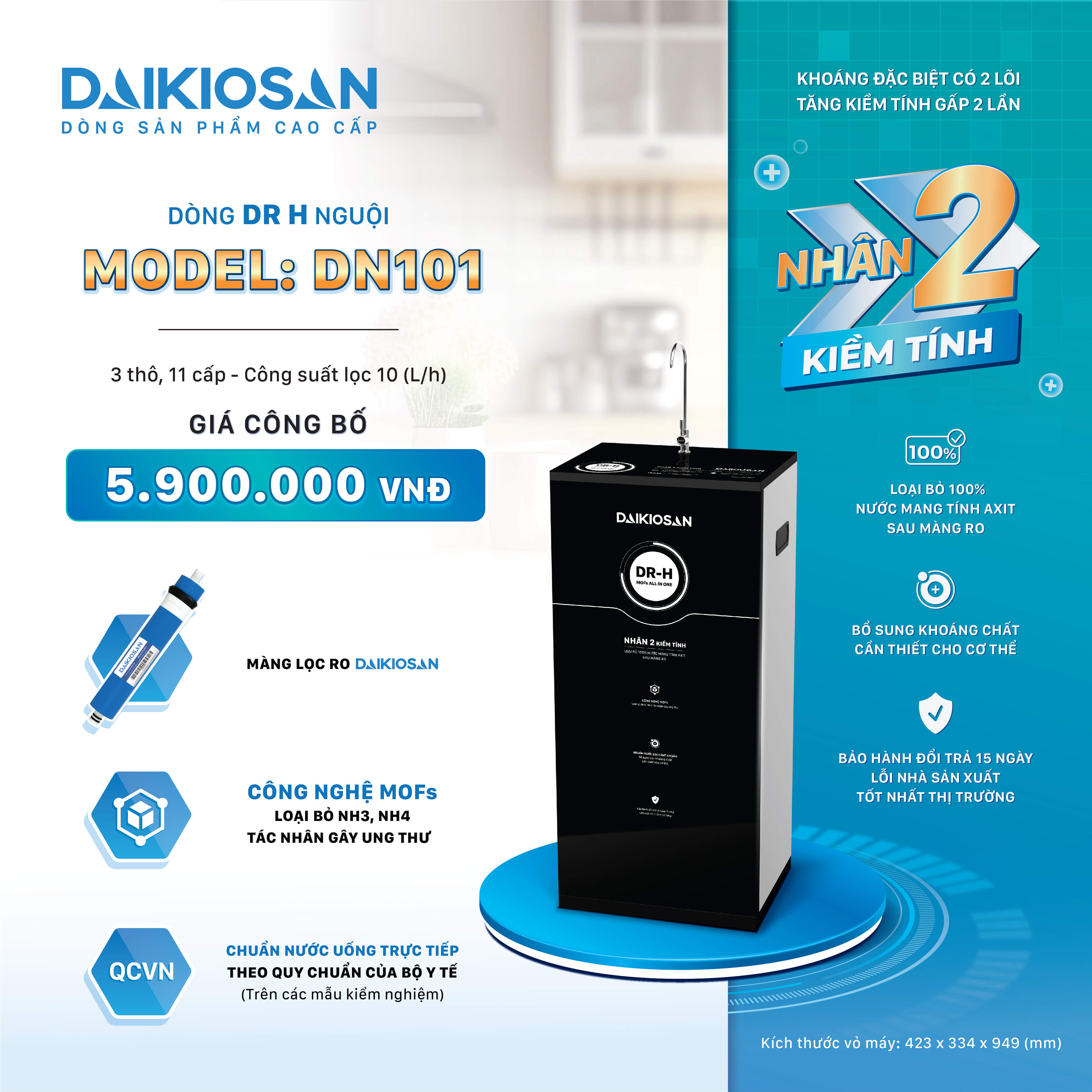 Máy lọc nước Daikiosan DR H DN101 ứng dụng công nghệ MOFs hiện đại, xứng đáng là chiếc Máy lọc nước “tất cả trong một” cho gia đình bạn thảnh thơi tận hưởng cuộc sống tiện nghi và an toàn. Máy lọc nước Daikiosan DR H DN101 giúp máy lọc nước hấp thu một cách hiệu quả các chất như NH3 (Amoni) và NH4 (Amoniac)... những tác nhân gây ô nhiễm trong nước. Đặc biệt, giúp hỗ trợ tránh các tác nhân gây bệnh ung thư và khử mùi, hôi, clo… tồn dư trong nước, đảm bảo nước uống luôn sạch và an toàn.